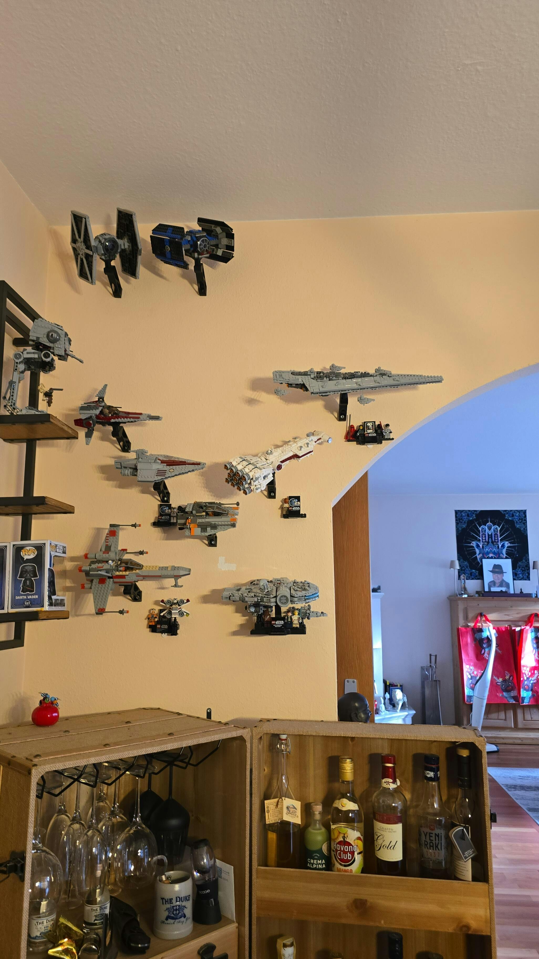 Einfache Montage an der Wand sowie Austausch der Lego Star Wars Raumschiffe ohne Demontage der Halterung.